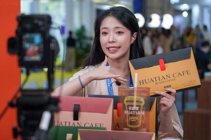2024年7月24日,參展商在南博會(huì)咖啡產(chǎn)業(yè)館直播帶貨。新華社記者 王靜頤 攝