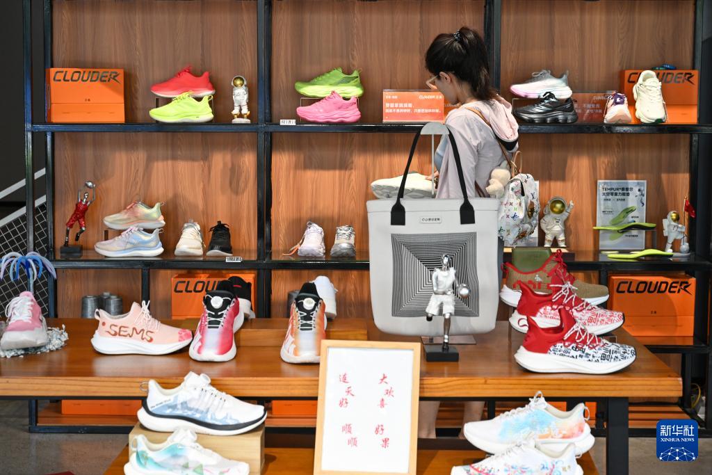8月19日,消費者在福建莆田雙馳科技定制工廠店挑選個性化定制鞋。