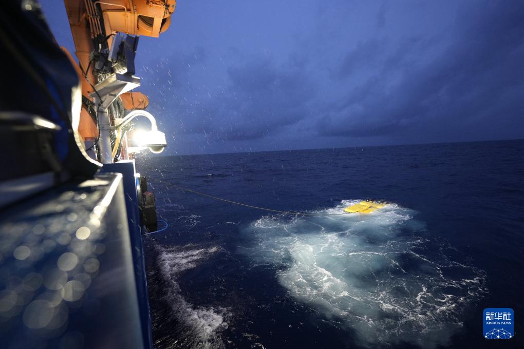 8月22日晚,考察隊員在“中山大學”號船艉主甲板冒雨布放“海琴”號。