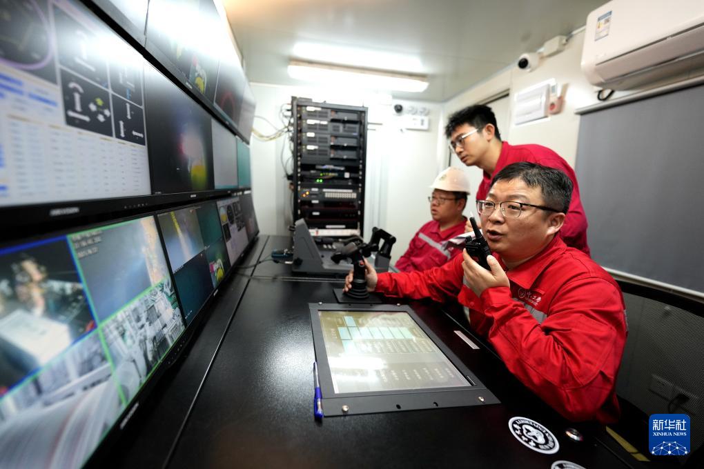 8月22日晚,考察隊員在“海琴”號水面監(jiān)控動力站內(nèi)工作。