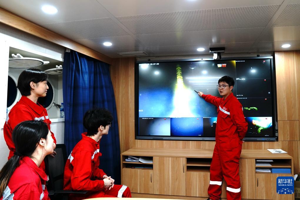 8月22日晚,在“中山大學”號科考中心,考察隊員觀看討論“海琴”號從深海發(fā)回的“現(xiàn)場直播”。