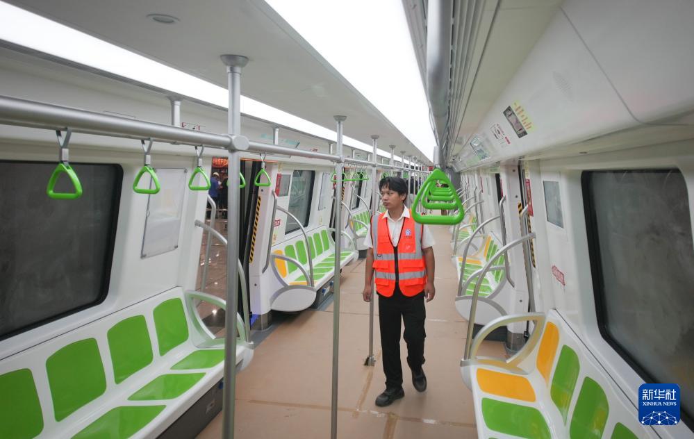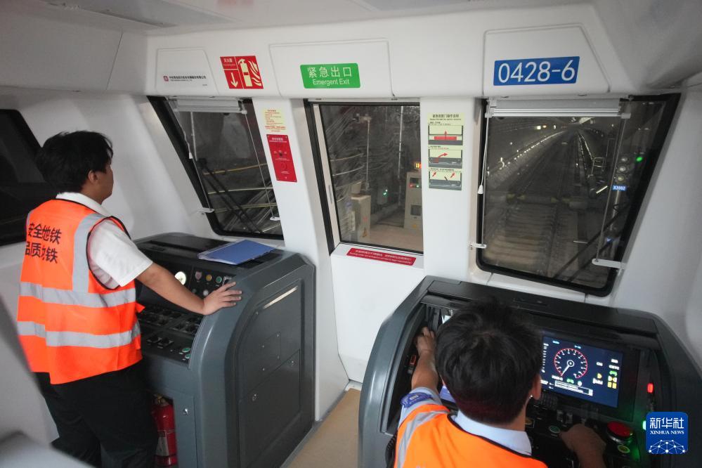 8月31日,濟(jì)南地鐵工作人員在試運(yùn)行的地鐵4號(hào)線列車內(nèi)查看。