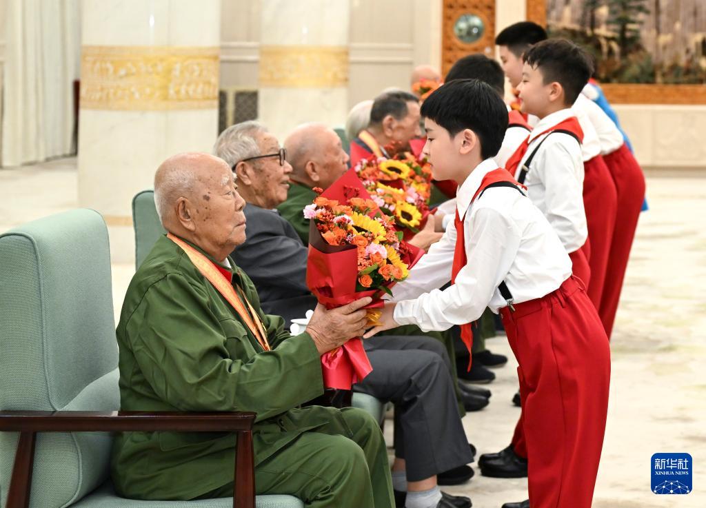 9月3日晚,紀(jì)念中國(guó)人民抗日戰(zhàn)爭(zhēng)暨世界反法西斯戰(zhàn)爭(zhēng)勝利80周年文藝晚會(huì)《正義必勝》在北京人民大會(huì)堂隆重舉行。這是晚會(huì)開(kāi)始前,少先隊(duì)員向前來(lái)觀看演出的抗戰(zhàn)老戰(zhàn)士老同志代表獻(xiàn)花。