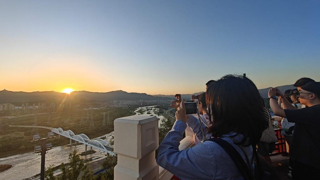 在永定河集北出口,新修的向河步道蜿蜒向上,直通石景山(本山)的觀景平臺?!拔覀冃陆?0米向河步道、提升改造了600米既有步道,改造提升后的石景山形成了南山小院、古建群、功碑閣三大文化景觀區(qū)域?!笔吧焦沤ㄈ何奈锉9芩L李偉介紹,游客逛完“永定河集”,直接從登山步道可至古建群區(qū)域,再從古建群登上功碑閣三層最高點(diǎn),得以登高望遠(yuǎn),觀首鋼全貌、賞落日余暉。
