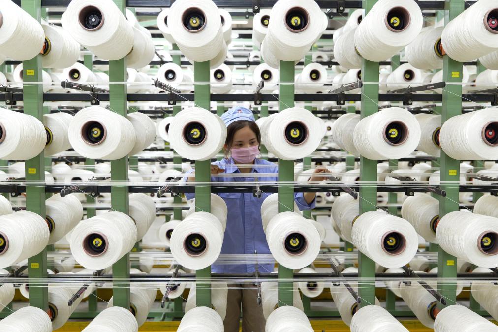 在中國平煤神馬集團簾子布發(fā)展公司布機車間,工作人員在檢查絲線生產情況。新華社記者 李嘉南 攝