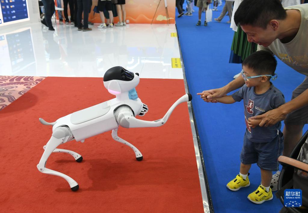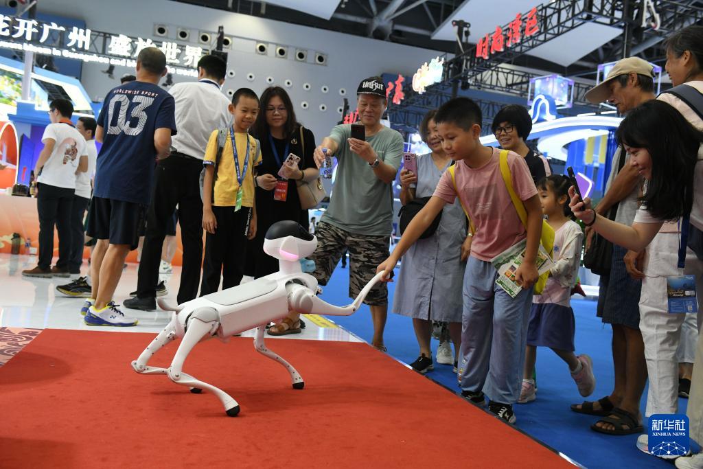 9月13日,在2025廣東國際旅游產業(yè)博覽會現場,觀眾與萌寵機器狗互動。