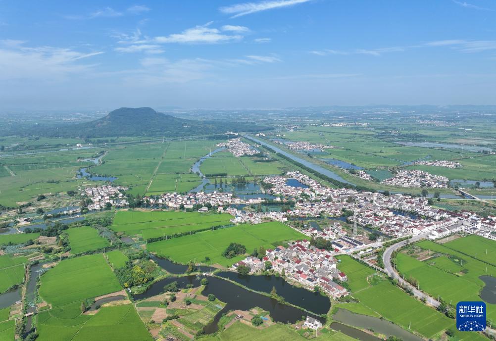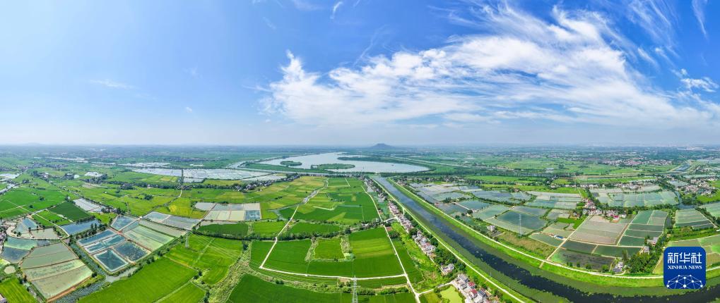 9月15日拍攝的句容赤山湖及周邊農(nóng)田(無人機(jī)全景照片)。