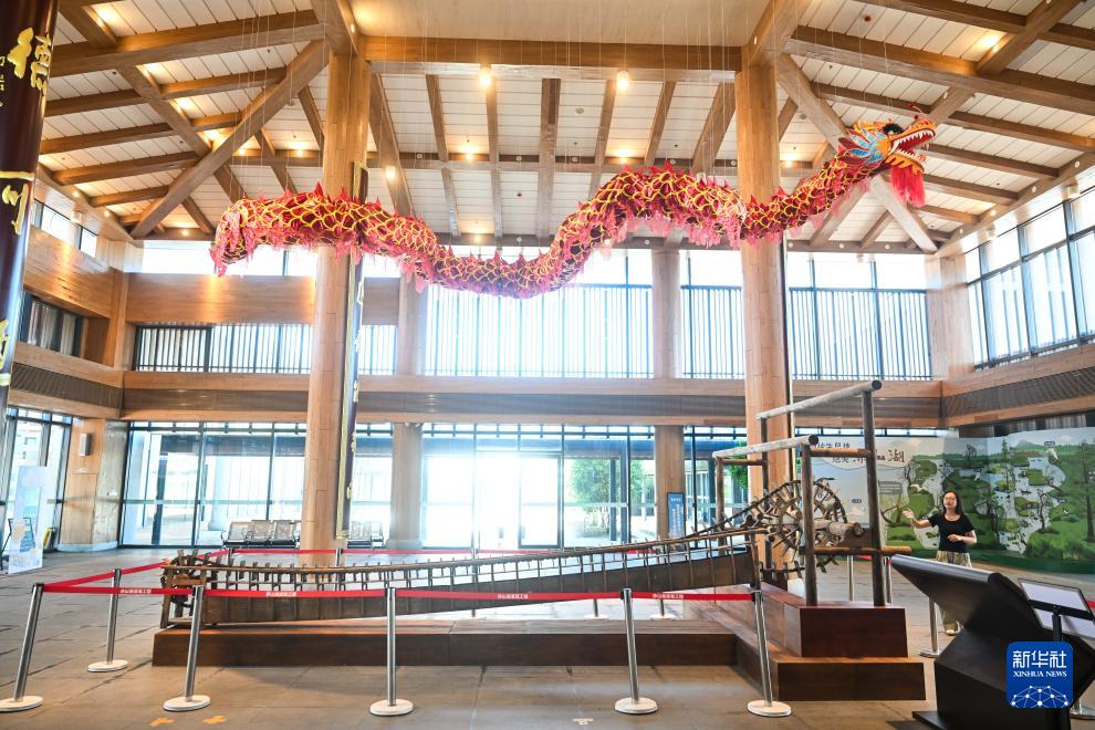 9月15日,在赤山湖灌溉工程展示館,工作人員介紹龍骨水車。