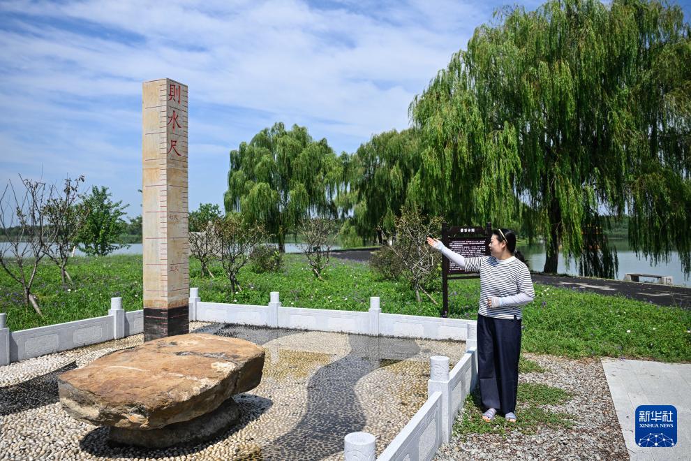 9月15日,在赤山湖國(guó)家濕地公園,工作人員介紹磐石水則。