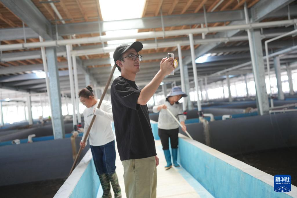 9月16日,在浙江省三門縣健跳鎮(zhèn)三門東航水產(chǎn)育苗科技有限公司,工作人員利用手機(jī)APP實(shí)時(shí)監(jiān)控凈養(yǎng)池的水質(zhì)狀況。