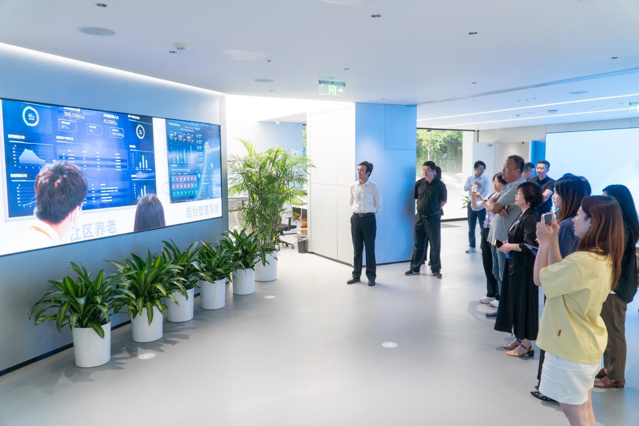 在通用技術(shù)郵電器材北京公司旗下的通用技術(shù)多模態(tài)智能空間與應(yīng)用技術(shù)創(chuàng)新中心,巨大的電子液晶屏幕實(shí)時顯示著北京市豐臺區(qū)西羅園社區(qū)養(yǎng)老服務(wù)管理情況。