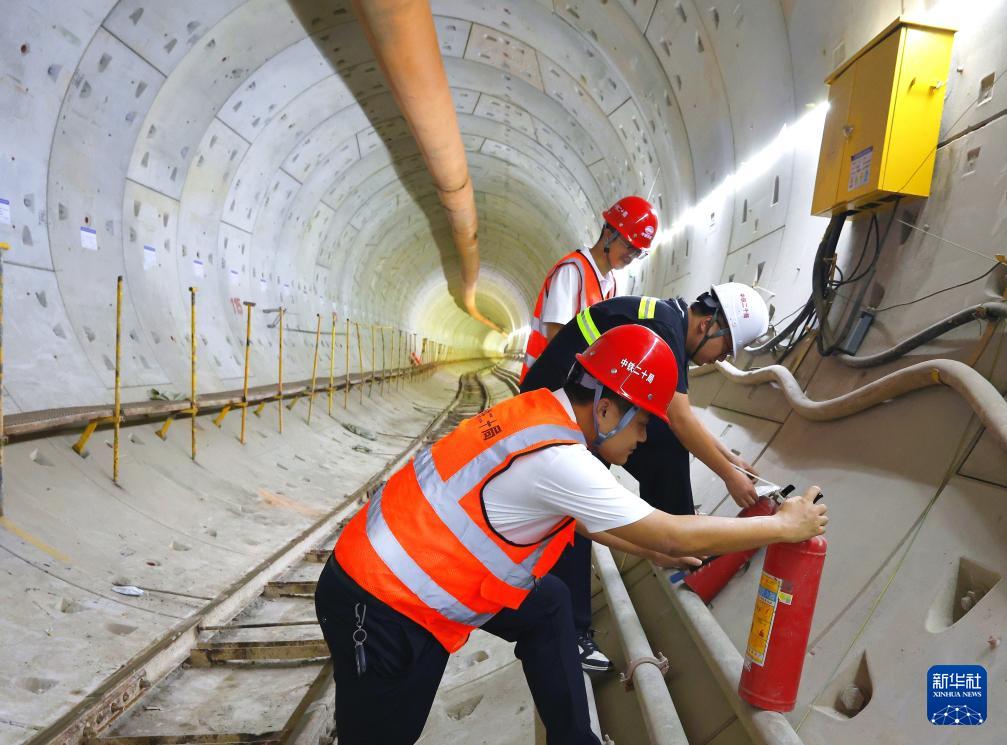 安全監(jiān)理人員在深圳地鐵16號線共建管廊檢查施工現(xiàn)場的消防設(shè)施(9月16日攝)。