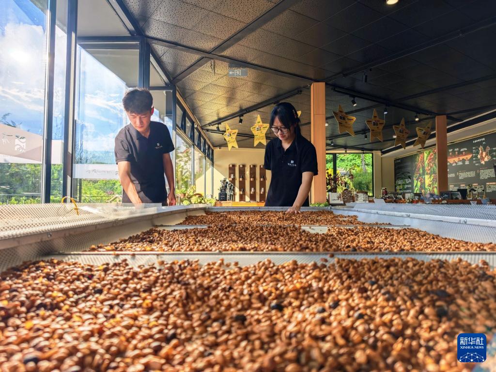 9月20日,普洱市思茅區(qū)南屏鎮(zhèn)南島河村白沙坡小組的“美麗星村·有風(fēng)咖谷”工作人員在展示咖啡豆的處理過程。