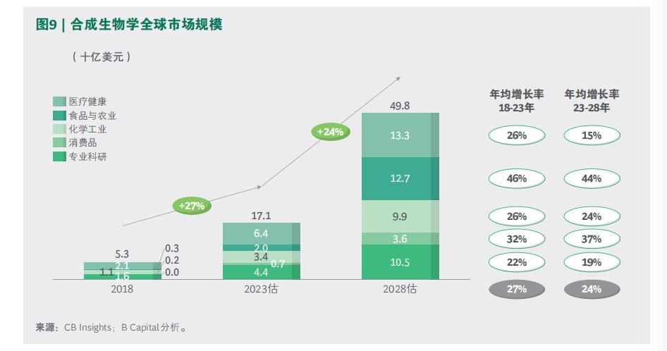 據(jù)上海合成生物學(xué)創(chuàng)新中心和波士頓咨詢公司共同發(fā)布的《中國(guó)合成生物產(chǎn)業(yè)白皮書(shū)2024》顯示,全球合成生物學(xué)市場(chǎng)規(guī)模從2018年的53億美元增長(zhǎng)到2023年的超過(guò)170億美元,平均年增長(zhǎng)率達(dá)27%,預(yù)計(jì)未來(lái)將持續(xù)增長(zhǎng),并在2028年達(dá)到近500億美元。