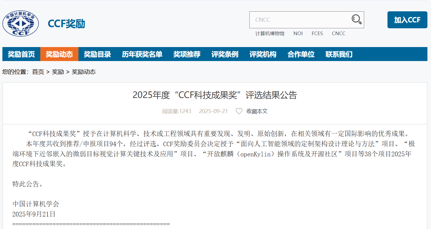 本報(bào)訊 (記者 李洋)近日,中國(guó)計(jì)算機(jī)學(xué)會(huì)(CCF)揭曉2025年度“CCF 科技成果獎(jiǎng)”評(píng)選結(jié)果,38個(gè)項(xiàng)目分獲自然科學(xué)獎(jiǎng)、技術(shù)發(fā)明獎(jiǎng)和科技進(jìn)步獎(jiǎng)。其中,“開放麒麟(openKylin)操作系統(tǒng)及開源社區(qū)”項(xiàng)目憑借在核心技術(shù)突破與產(chǎn)業(yè)落地中的突出貢獻(xiàn),斬獲代表該獎(jiǎng)項(xiàng)最高榮譽(yù)的科技進(jìn)步特等獎(jiǎng)。openKylin作為中國(guó)“十四五”期間孕育的開源力量,由麒麟軟件發(fā)起并捐贈(zèng),由開放原子開源基金會(huì)運(yùn)營(yíng),致力于打造全球領(lǐng)先的智能桌面操作系統(tǒng)開源根社區(qū)。