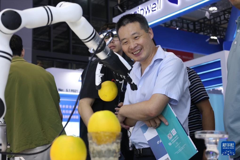 9月23日,參觀者在一個進行抓取動作演示的機器手展品前駐足觀看。
