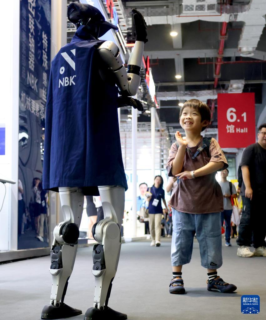 9月23日,小朋友在展會現(xiàn)場與人形機器人互動。