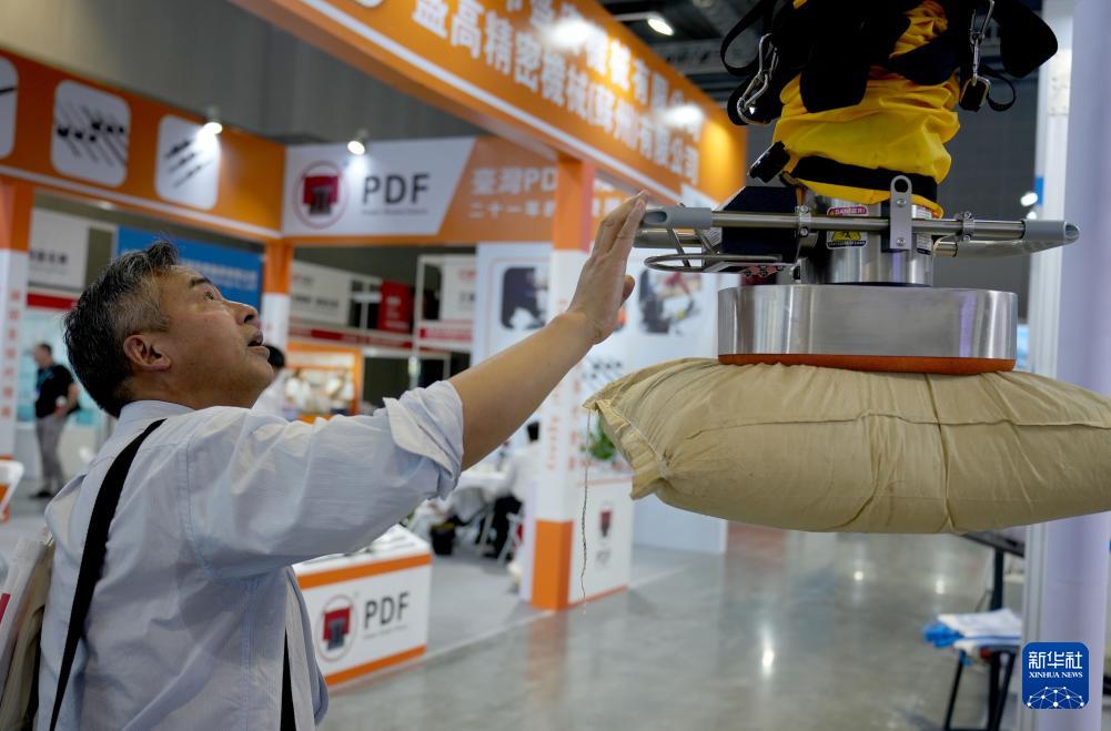 9月23日,參觀者在一個重物搬運輔助設(shè)備旁駐足觀看。