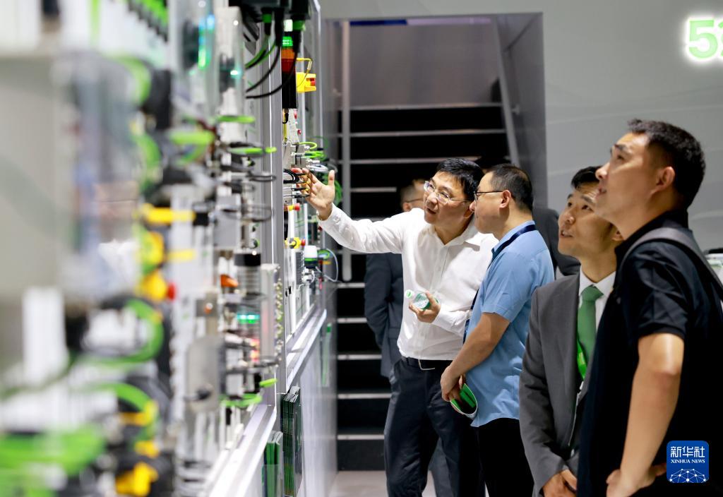 9月23日,參觀者在一組工業(yè)自動化設(shè)備元件綜合展示墻前交流討論。