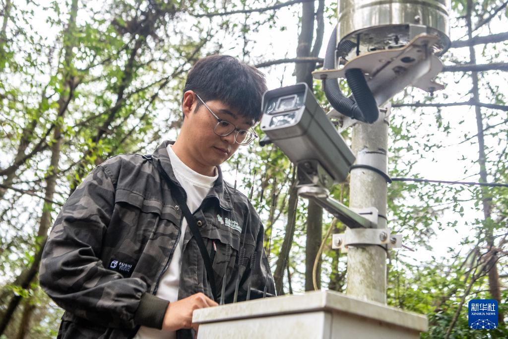 9月23日,在金佛山黑葉猴遠(yuǎn)程視頻監(jiān)控點,工作人員李新在檢查觀測設(shè)備。