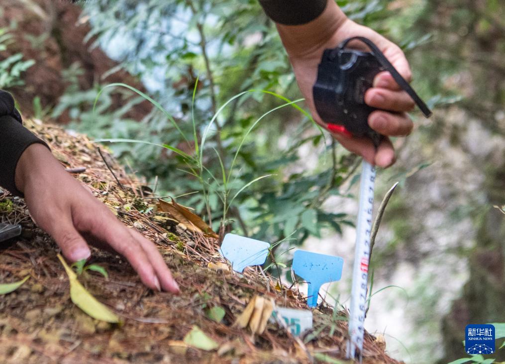 9月22日,在銀杉群落監(jiān)測樣地,李新在記錄野生銀杉幼苗生長情況。