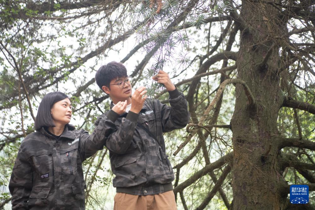 9月22日,在銀杉群落監(jiān)測樣地,工作人員李新(右)、王泳鰻在查看001號銀杉的健康狀況。