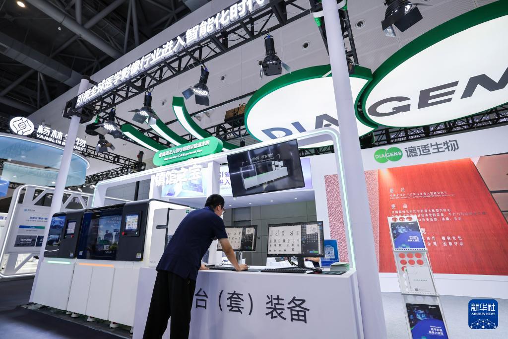 這是9月25日在第四屆全球數(shù)字貿(mào)易博覽會數(shù)字醫(yī)療展區(qū)拍攝的德適生物自主研發(fā)的“全自動無人值守細(xì)胞實(shí)驗(yàn)流水線”。