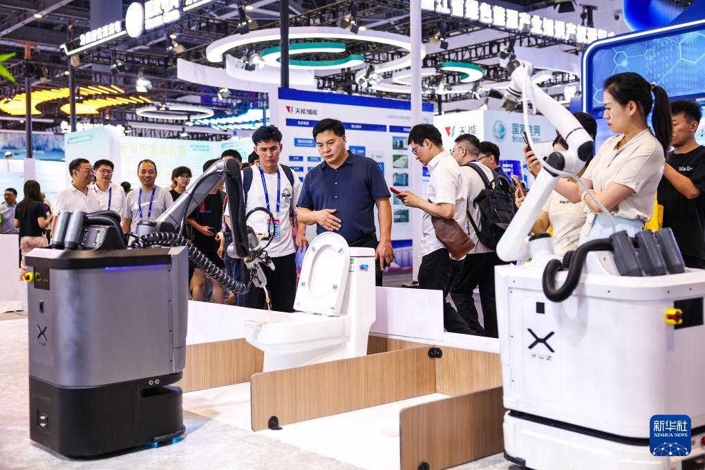 9月25日,觀眾在第四屆全球數(shù)字貿(mào)易博覽會人工智能展區(qū)觀看一款自清潔機(jī)器人工作。