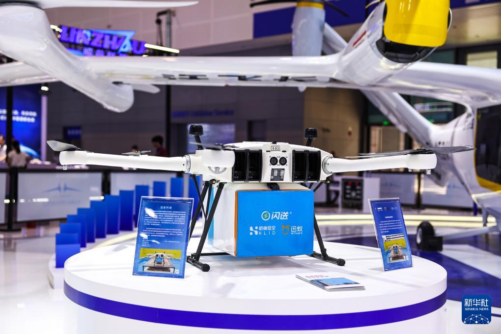這是9月25日在第四屆全球數(shù)字貿(mào)易博覽會數(shù)智出行展區(qū)拍攝的快遞無人機(jī)。