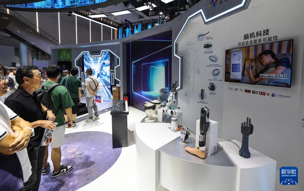 9月25日,在第四屆全球數(shù)字貿(mào)易博覽會的數(shù)智未來主題展區(qū)的杭州六小龍專區(qū),觀眾在觀看強(qiáng)腦科技的仿生靈巧手。