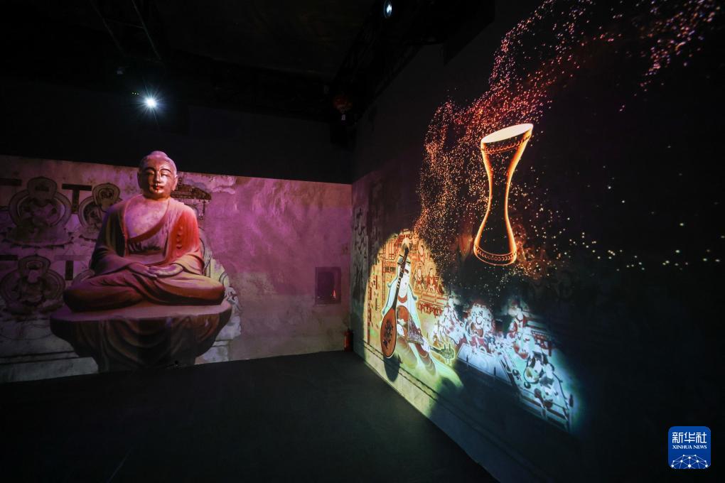 這是9月25日拍攝的第四屆全球數(shù)字貿(mào)易博覽會數(shù)字文娛展區(qū)內(nèi)的洞窟沉浸式展廳,該展廳是浙江音樂學(xué)院與敦煌文旅集團(tuán)利用AI技術(shù)聯(lián)合打造的敦煌石窟互動音樂特展。