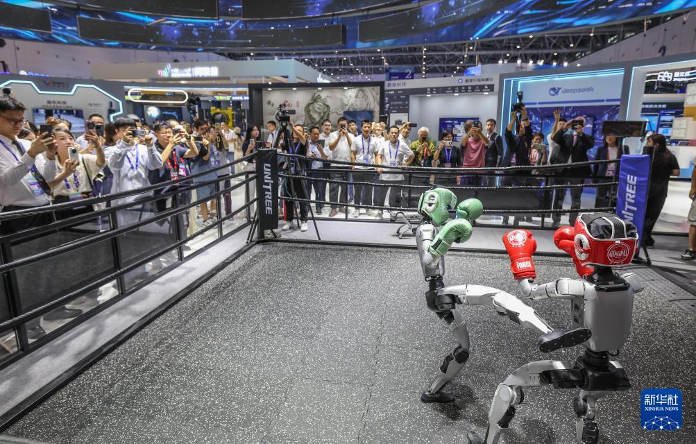 9月25日,在第四屆全球數(shù)字貿(mào)易博覽會數(shù)智未來主題展區(qū)的杭州六小龍專區(qū),宇樹科技的人形機(jī)器人在進(jìn)行格斗擂臺賽。