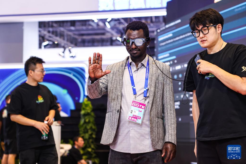 9月25日,外籍客商(右二)在第四屆全球數(shù)字貿(mào)易博覽會人工智能展區(qū)體驗(yàn)智能眼鏡設(shè)備。