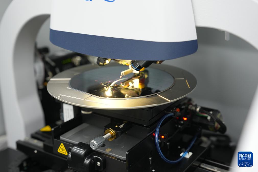 這是在上海交通大學(xué)無錫光子芯片研究院光子芯片中試線接受檢測的芯片晶圓(9月25日攝)。