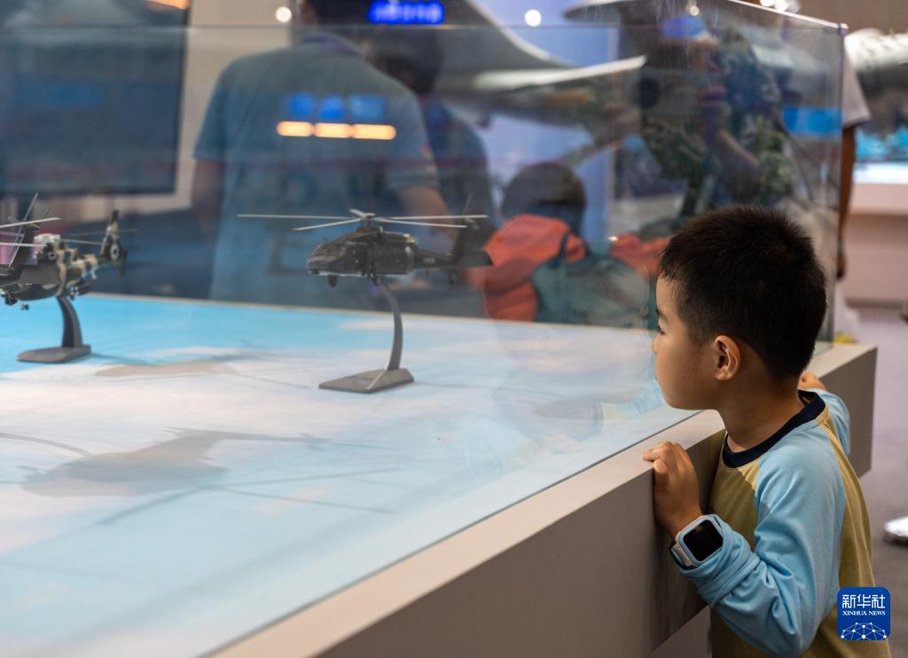 9月27日,在第十三屆中國(綿陽)科博會上,小觀眾在欣賞直升機模型。