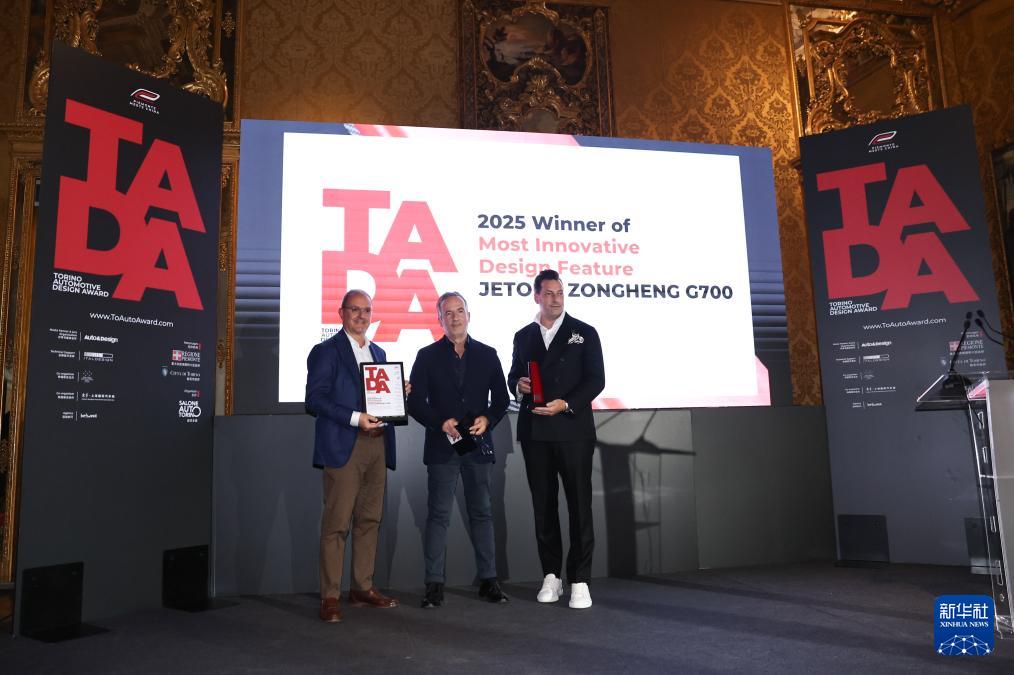 9月26日,在意大利都靈,榮獲“都靈汽車設(shè)計(jì)獎(jiǎng)”最佳創(chuàng)新設(shè)計(jì)獎(jiǎng)的捷途“縱橫G700”代表領(lǐng)獎(jiǎng)。
