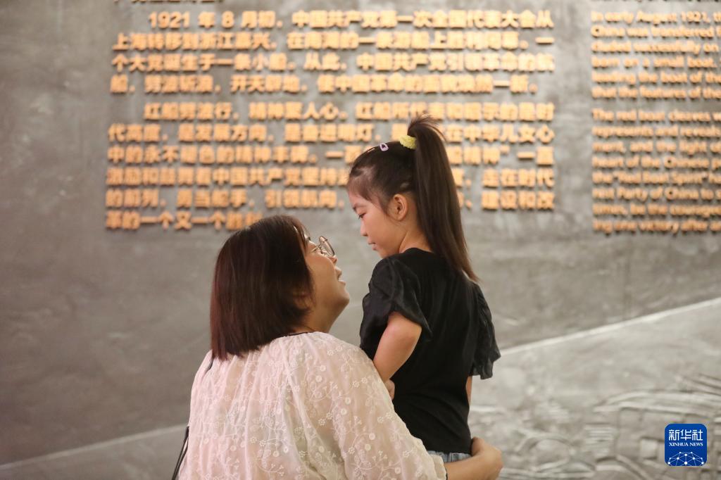 10月7日,在浙江省嘉興市南湖革命紀(jì)念館,家長(zhǎng)為孩子講解革命歷史。