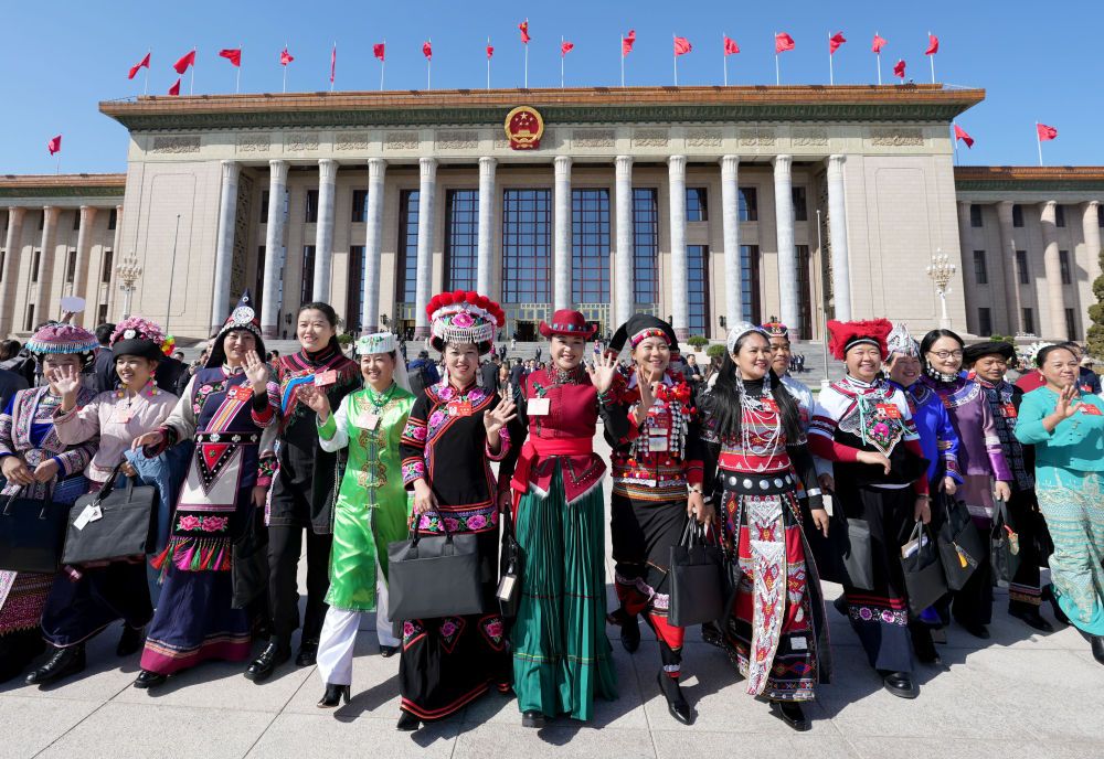 2024年3月8日,十四屆全國人大二次會議第二次全體會議結束后,女代表在北京人民大會堂前合影留念。新華社記者 王毓國 攝