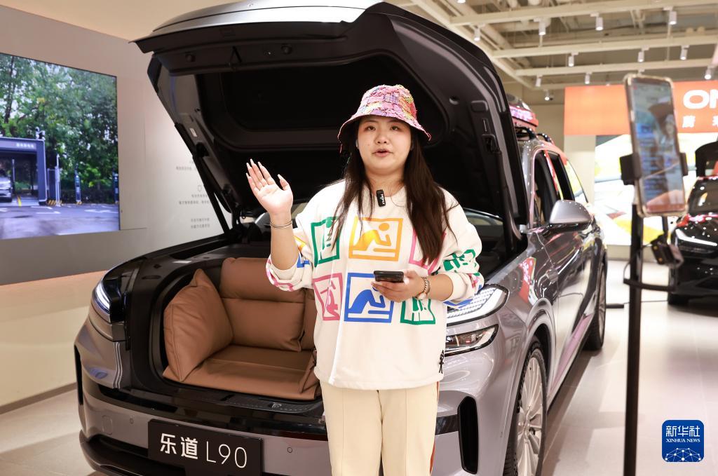 10月14日,在湖北省武漢市武昌區(qū)一家商場,主播為網(wǎng)友介紹新能源汽車性能。