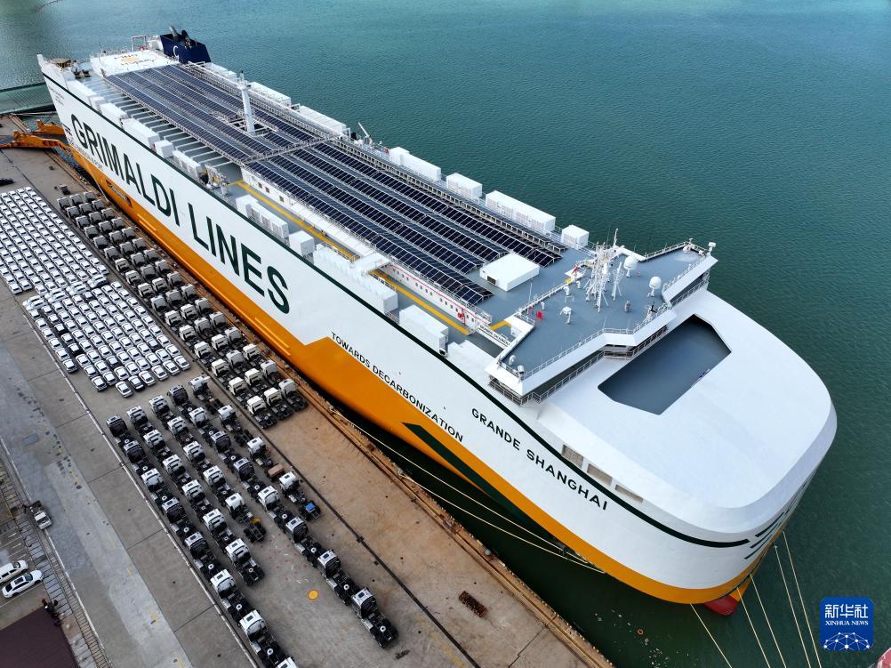 10月14日,在江蘇省連云港港東方港務分公司碼頭,滾裝輪裝載汽車準備外運(無人機照片)。