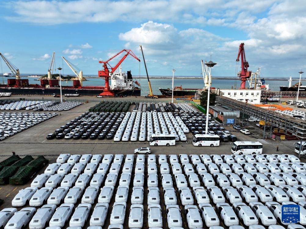 10月14日,在江蘇省連云港港東方港務分公司碼頭,大批汽車準備裝船外運(無人機照片)。