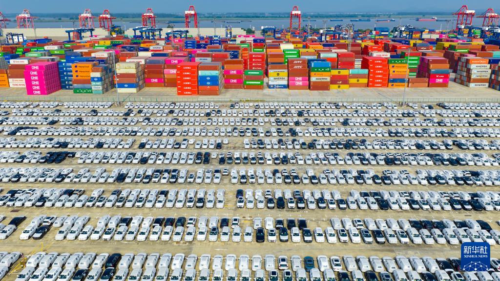 10月4日在江蘇省港口集團南京港龍?zhí)陡蹍^(qū)拍攝的準備裝船出口的汽車(無人機照片)。