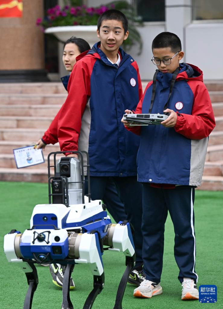 10月13日,新疆生產(chǎn)建設兵團第一中學學生在科技節(jié)開幕式上操控智能機器狗。
