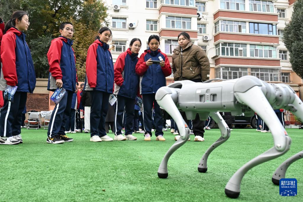 10月14日,新疆生產(chǎn)建設兵團第一中學學生觀看智能機器狗進行復雜運動。