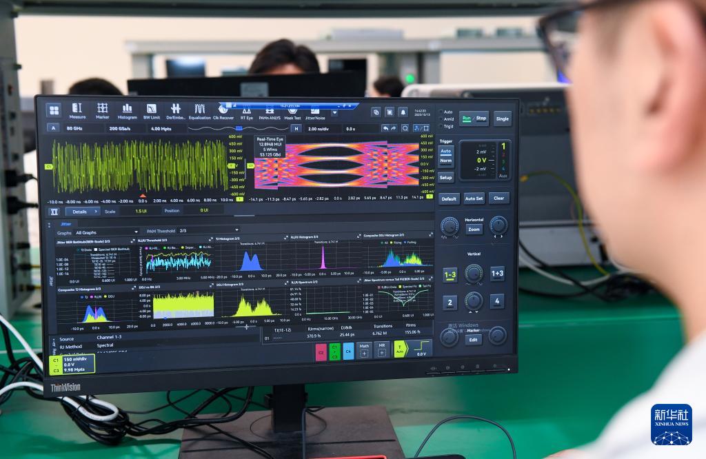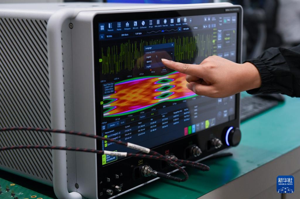 10月13日,在深圳市萬(wàn)里眼技術(shù)有限公司,實(shí)驗(yàn)室人員在測(cè)試DDR5接口信號(hào)。