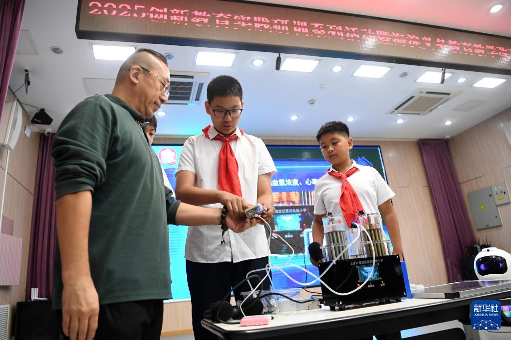 10月15日,在北京市海淀區(qū)第四實驗小學,人工智能社團的學生用其制作的“極客氫氧太陽能保健機”為現(xiàn)場嘉賓進行健康監(jiān)測。