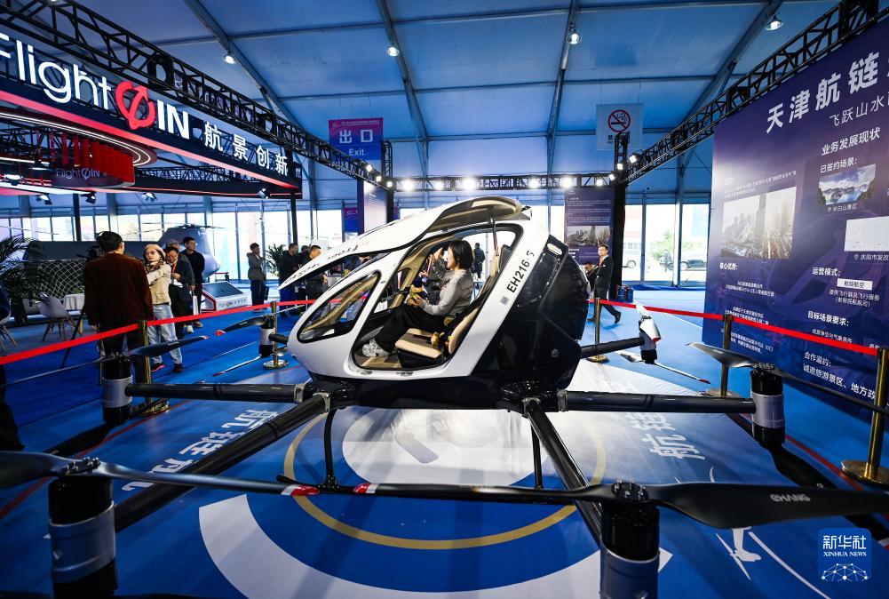 10月16日,觀眾在天津直博會低空經(jīng)濟館內(nèi)體驗一款垂直起降(eVTOL)航空器。