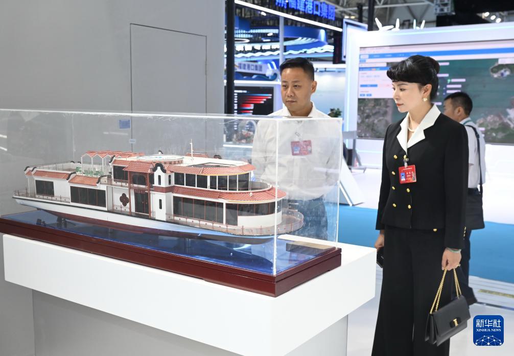 10月16日,與會人員在寧德時(shí)代展區(qū)觀看“閩江會客廳”電動游船模型。