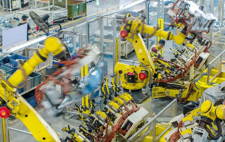 2025年10月9日,浙江省湖州市長(zhǎng)興經(jīng)濟(jì)技術(shù)開發(fā)區(qū)的長(zhǎng)興地通汽車部件有限公司技術(shù)人員操控工業(yè)機(jī)器人生產(chǎn)新能源汽車配件(無(wú)人機(jī)照片)。新華社發(fā)(譚云俸攝)