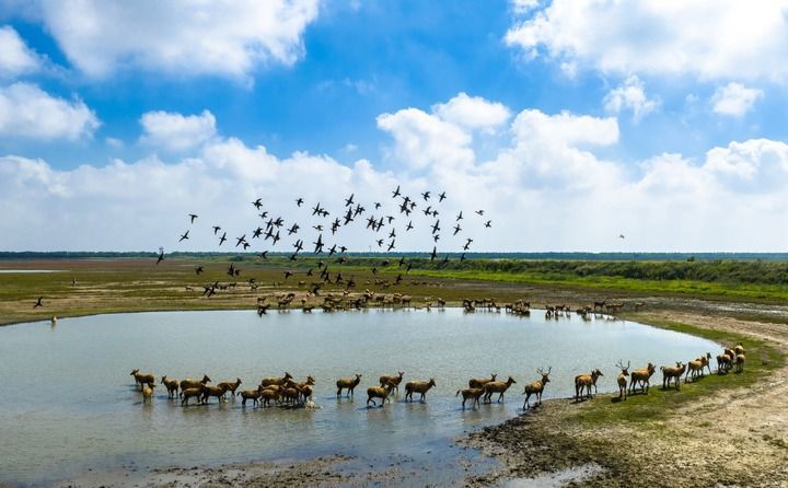2025年10月11日,在江蘇東臺(tái)條子泥濕地,候鳥飛翔,成群野生麋鹿悠閑散步,一派人與自然和諧共生的生態(tài)美景(無(wú)人機(jī)照片)。新華社發(fā)(孫家錄攝)